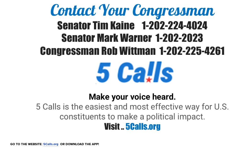 Continue to call Congressman Wittman and Senators Kaine and Warner. Use the 5Calls website or app for issues, scripts and phone numbers. CALL EVERY DAY! It is our many calls that are pushing our Democratic Senators to act.